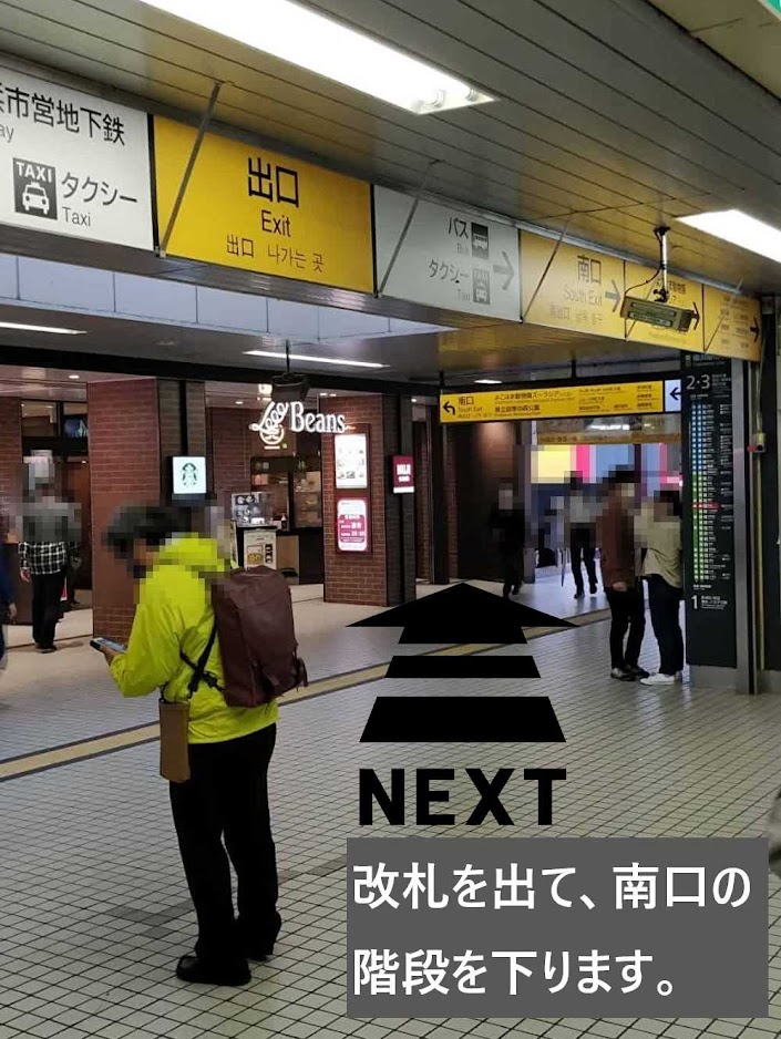 - 中山駅の改札を出て、南口に向かい階段を降ります。